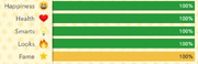 Stats are the four bars beneath your character that decide their well-being. They are randomised at the start, however happiness can be depression in new generations due to the fact that the character has only lost their parent/lover. It is natural for stats to enhance and lower a few points when aging up. Having higher percentages on the bars volition make a graphic symbol live longer and more successfully. Following the Fame update, if your character becomes famous, there is a fifth bar for Fame. Following the Politics update, there was another bar for Approval. In May 2019, Boosts were added to help characters with low stats be able to heighten their bar. Players would accept to watch an advertizement to get the heave if they are not a Bitizen.
